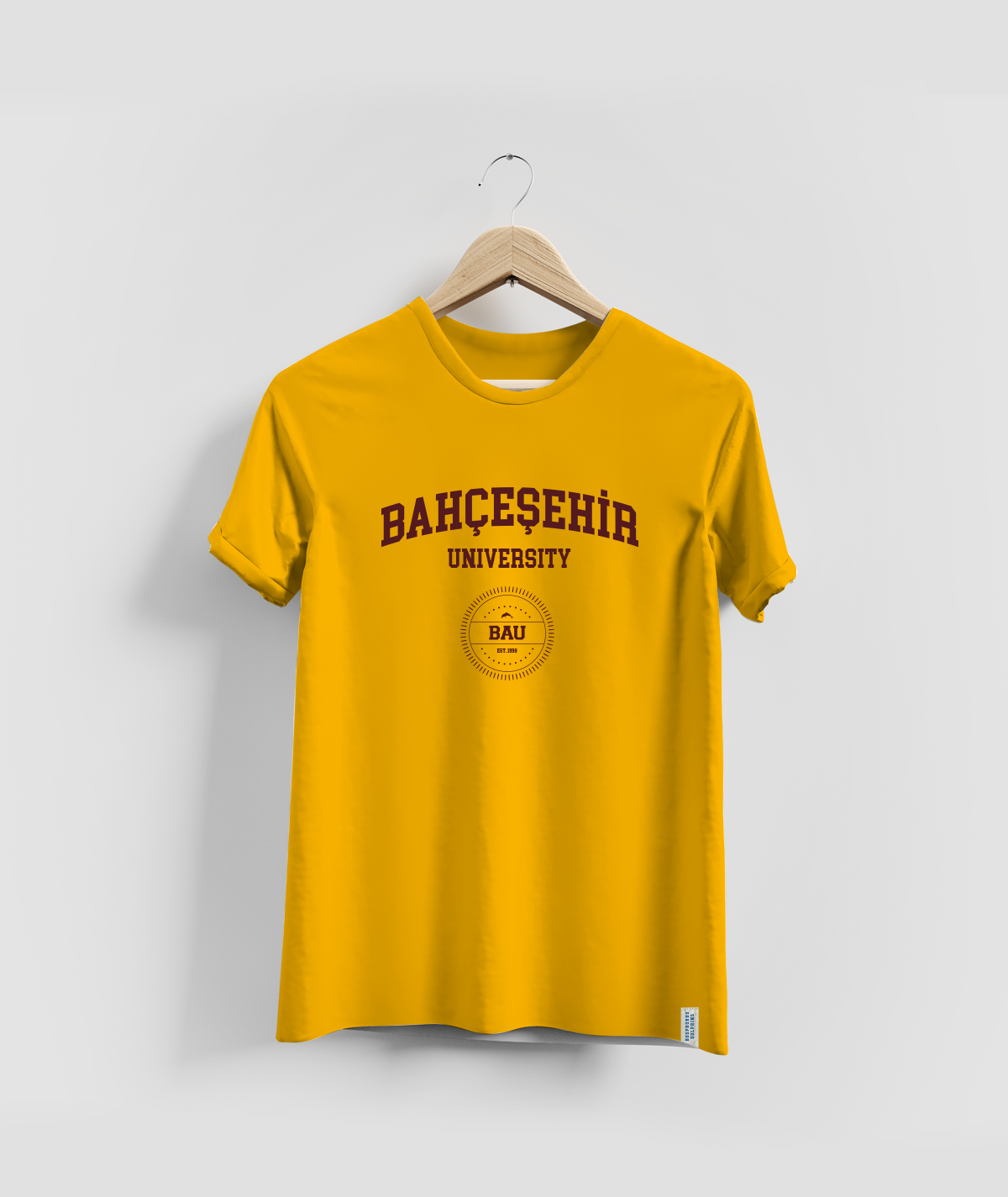 Kısa kollu, bisiklet yaka, Bahçeşehir University yazılı ve BAU logolu t-shirt.